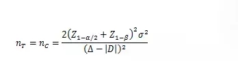 以下公式中,nT、nC分別為試驗(yàn)組和對(duì)照組的樣本量;Z1-α/2、Z1-β為標(biāo)準(zhǔn)正態(tài)分布的分?jǐn)?shù)位,當(dāng)α=0.05時(shí),Z1-α/2=1.96,當(dāng)β=0.2時(shí),Z1-β=0.842;(Z1-α/2+Z1-β)2=7.85